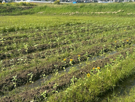 一か所だけひまわりが群生していますが、ひまわりの種を気前よく蒔いたのと