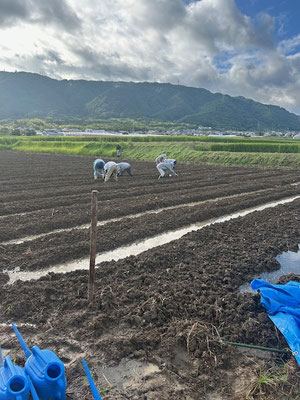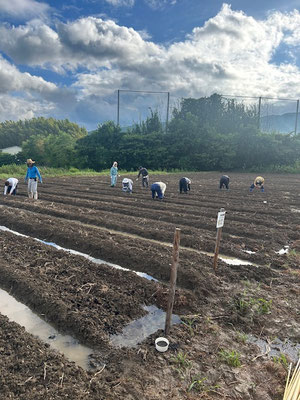 畑の土はカラカラなので、植え付けたら直ぐに水をまきながらの作業です。炎天下のなか、水分補給